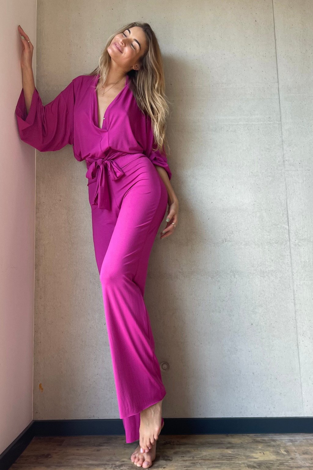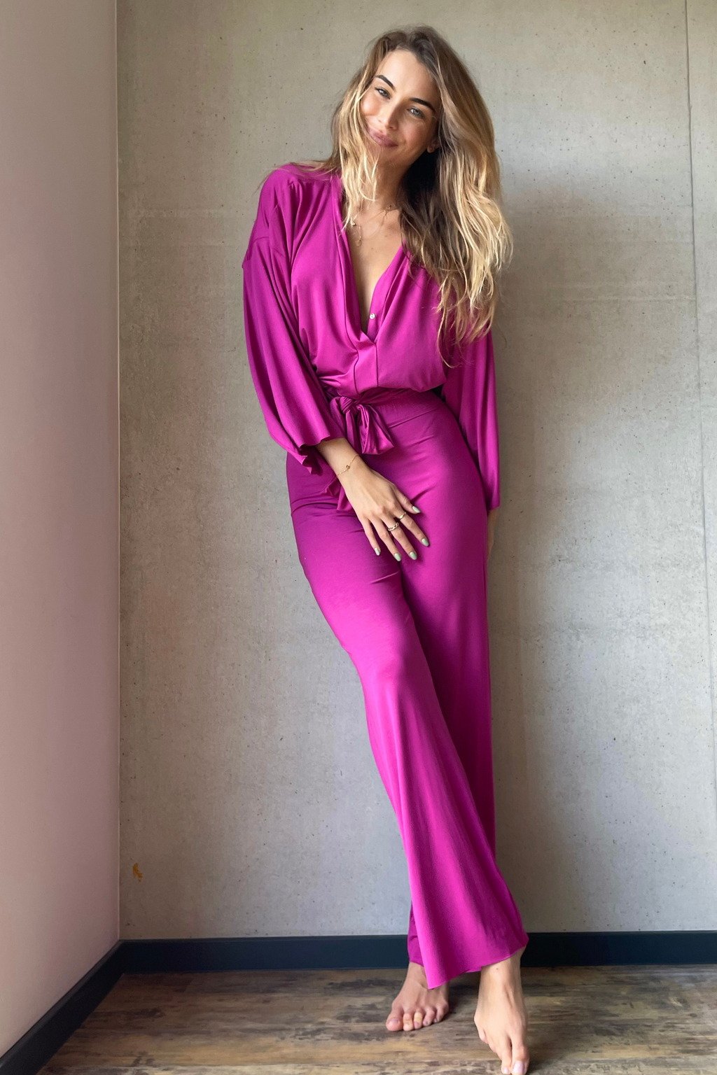 Wrap top z jemného bambusového úpletu, v sýtej cyklámenovej farbe.