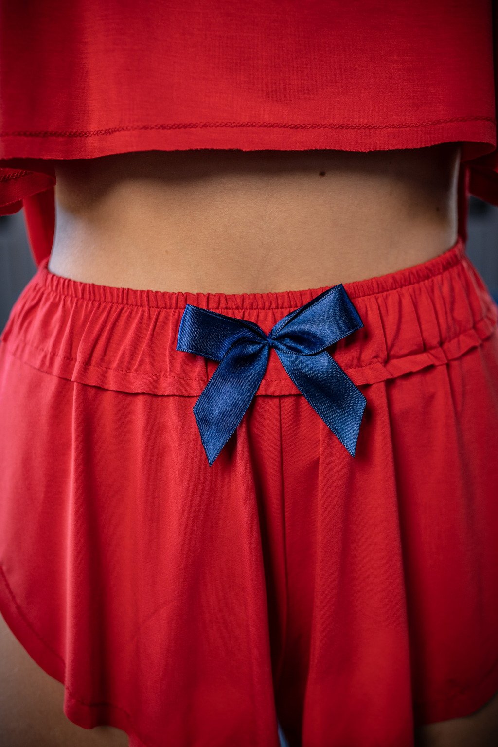 Kraťasy Butterfly shorts sú zaujímavé svojim strihom a dekorované zlatou saténovou mašličkou. Vhodné sú do setu spolu s topom v rovnakej alebo inej, Vami zvolenej farbe.