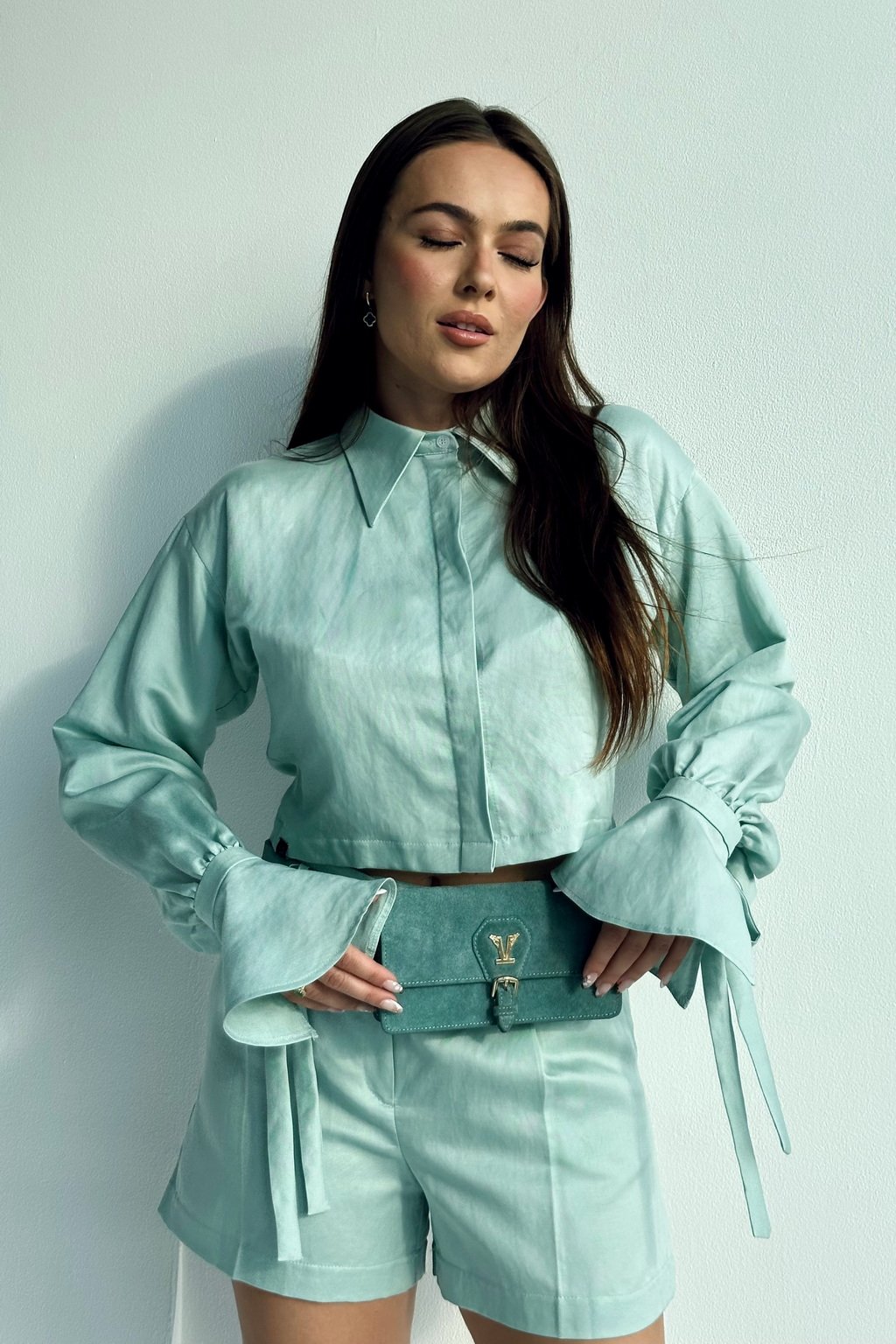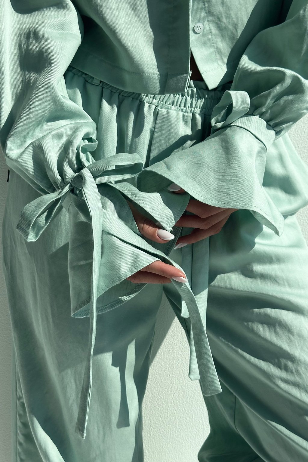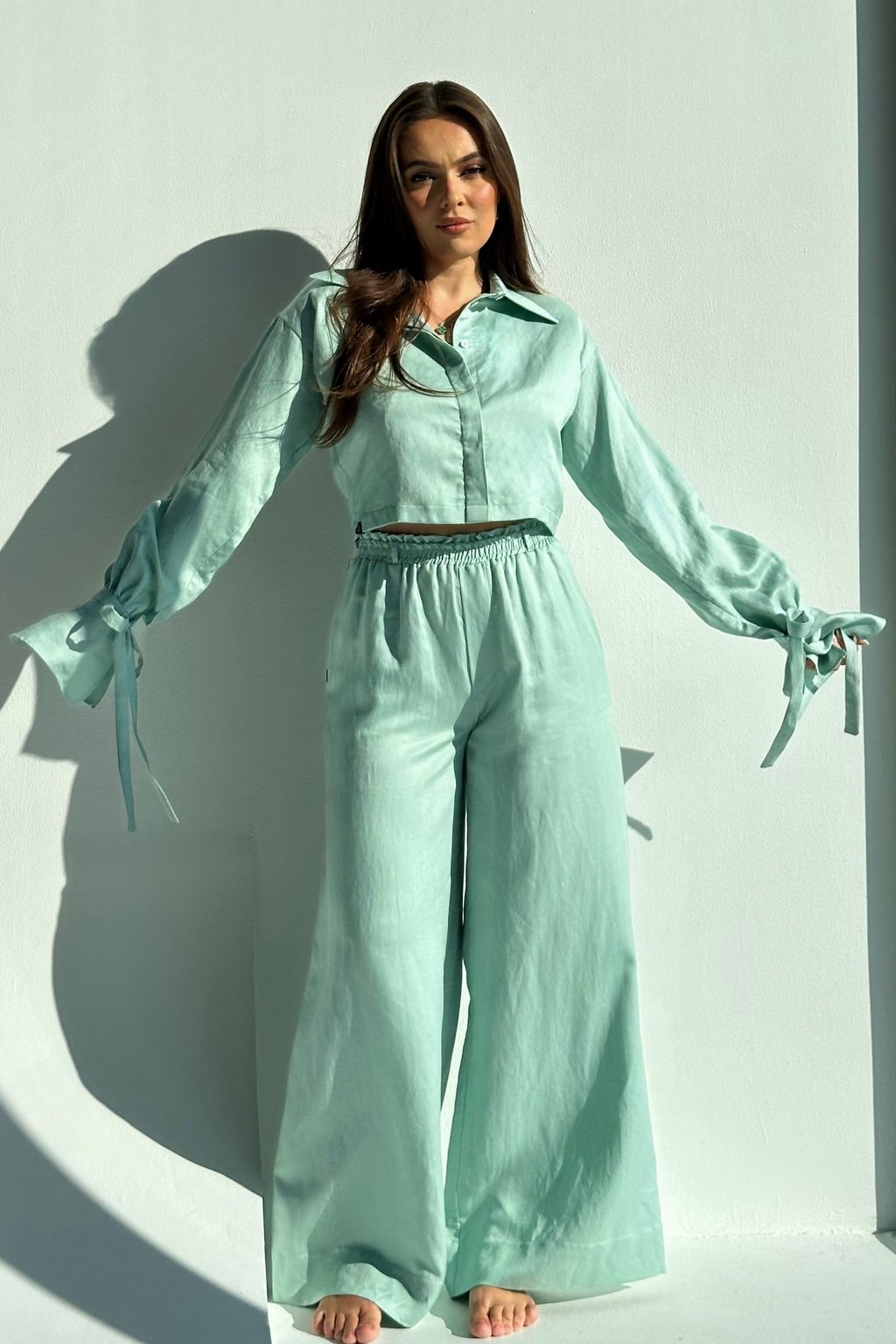 A cropped shirt that looks very elegant due to its beautiful bell sleeves that can be tied. It is suitable for both daytime and evening wear. You can wear it in several ways, either as part of a set and combine it with either our linen shorts or long pants, but it also looks beautiful in combination with any narrow or wide pants, or even with jeans. You can also wear the shirt as a "jacket" over your crop top for colder weather.
