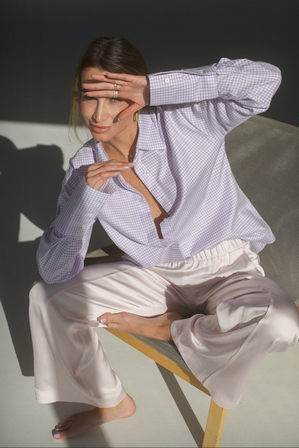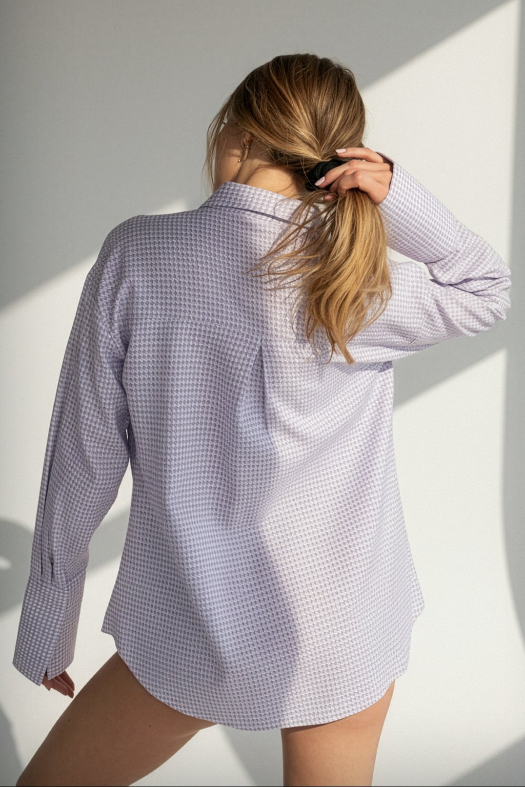 Košeľa LINDSAY | Mauve Pepita spája uvoľnenú eleganciu s jemnou ženskosťou. Vyrobená z mäkkučkej bavlny s drobným pepitovým vzorom, pôsobí ľahko, sviežo a prirodzene. Voľný, lichotivý strih s pevným golierom a dlhými manžetami dodáva modelu sofistikovaný, no stále nenútený vzhľad. Manžety môžeš nosiť zapnuté, rozopnuté alebo vyhnuté – podľa nálady, štýlu či momentu.